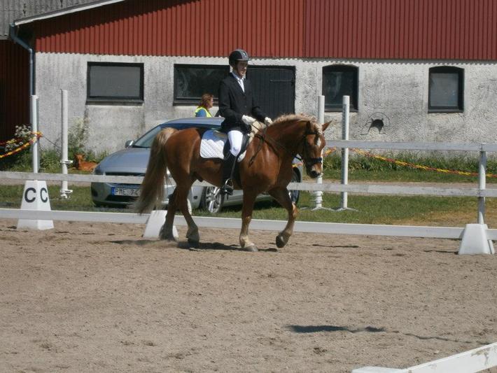 Jag började dock rida fram 30 min innan jag skulle in på banan, han ver extra pigg på framridningen(vilket är bra) Dock så blev han "normal" l latheten inne på banan. Så nästa gång rider jag fram i bara 20 min(10 min framskrittning ingår).Om jag jämför känslan på framridningen och banan så känndes det skit när jag red inne på banan. Men jag fick ändå ganska bra poäng tycker jag!