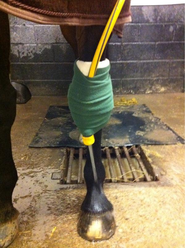 Kallt kranvatten i 20 min har bra effekt, helst inte längre eftersom man isåfall kan riskera köldskada och omvänd effekt. Vill man upprepa behandlingen, t.ex. vid en akut skada så kan man kyla 20 min var 4:e h, t.ex. på fånghästar eller hästar med akut senskada. Nedan kommer ett tips på hur man kan fästa slangen om man t.ex. vill mocka eller göra något annat i stallet medan hästen får benet kylt. För att fästa slangen högre upp så kan man ta en spänngjord runt magen och dra slangen genom den så att slangen hela tiden är uppe i luften och hästen inte riskerar att trampa på den eller trassla in sig. På bilden ses en häst i stallet som kyls från kotan och ner efter träning.