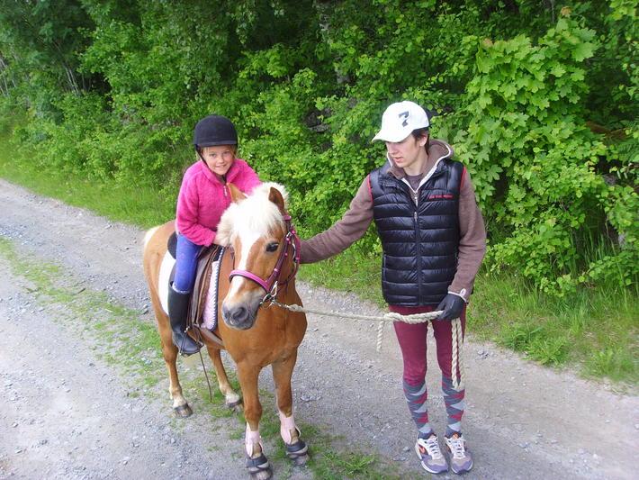 Men hon fick ta Nappe istället. Matilda ville även rida Oskar och storasyster ville ha sällskap. Så jag gick med och höll i Oskar, mamma och lillebror gick även med. Vi gick till sjön och tillbaka. Lillebror Felix ville även rida, så vi slängde upp honom på Nappe tillsammans med min storasyster. Han fick galoppera för första gången och han var jättelycklig! Han blir nog en riktig duktig hoppryttare! Annars så var Oskar inte alls tittig idag.