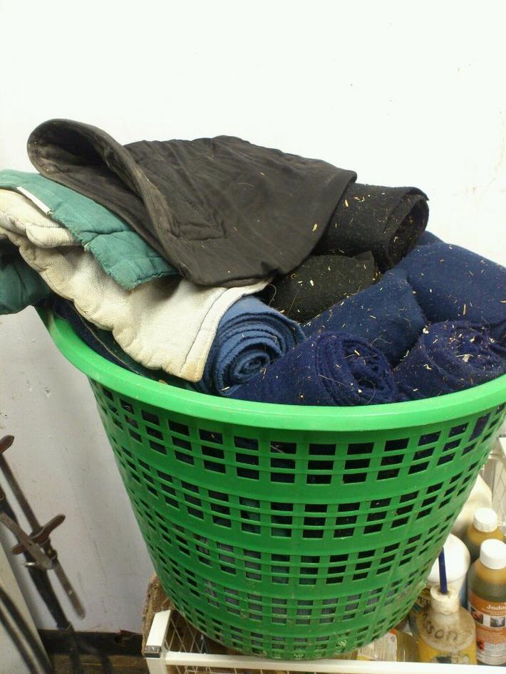 Korgen med alla lindor och paddar till hästarnas ben. Jag lindar deras ben på kvällen efter att de tävlat.