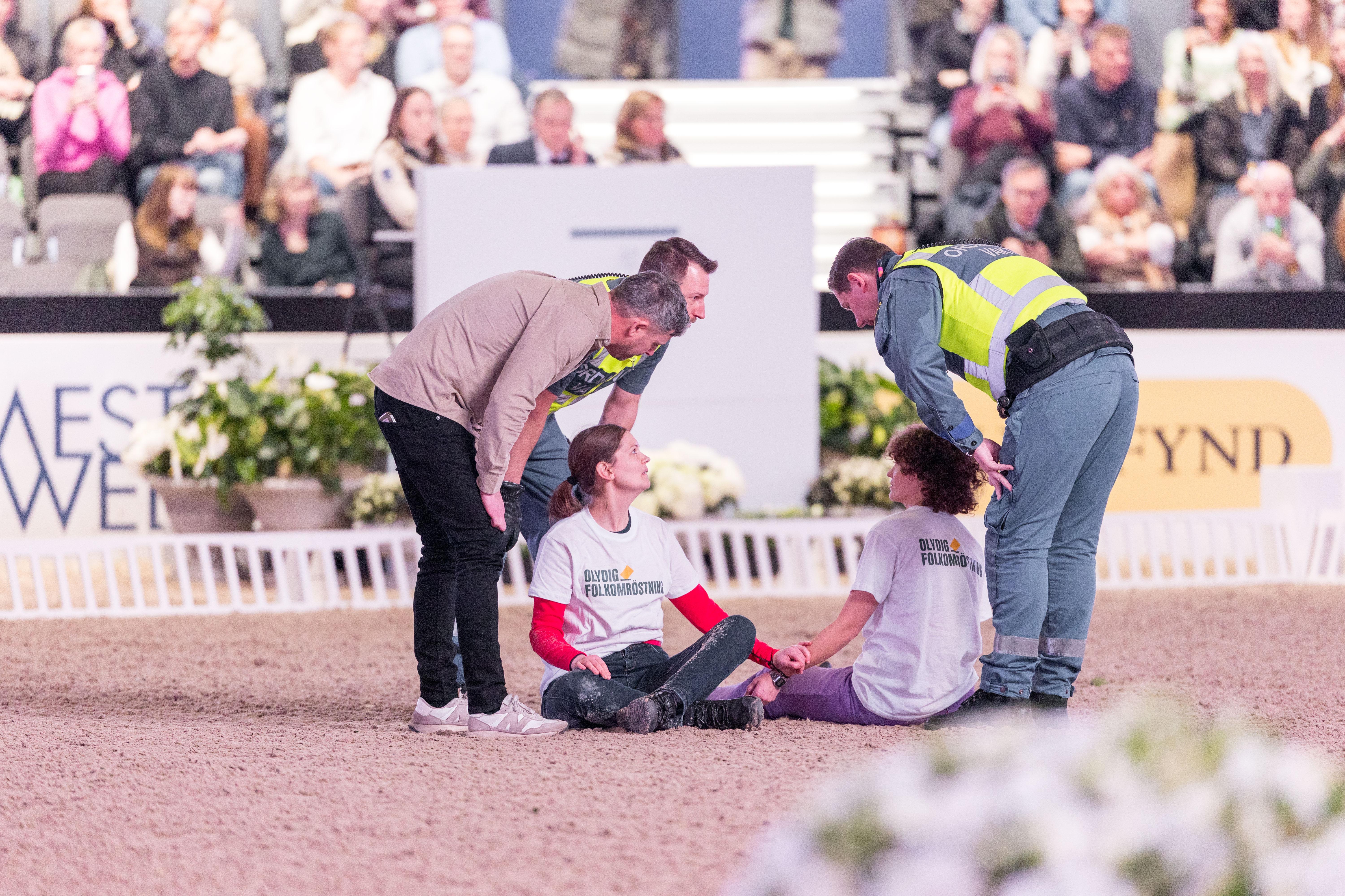 Aktivisterna satte sig inne på banan och blev utlyfta av väktare. Foto: Nicklas Elmrin/BildbyrånNyheterIdag 16:31Aktivister tog sig in på banan under världscupklassenCajsa Ekström Armancajsa@hippson.seSparaUnder lördagens världscupsklass i dressyr i Scandinavium tog sig två aktivister in på banan.Ämnen i artikelnGothenburg Horse Show