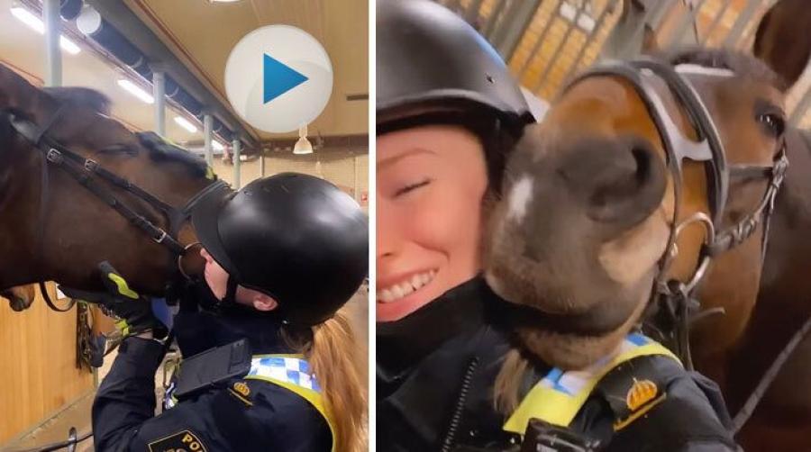 Polisrytteriet i Stockholm delar med sig av ett hjärtevärmande klipp. Hästen Bamse är över 180 cm i mankhöjd och stallets keligaste häst. Innan ridturen blir det obligatorisk mysstund.