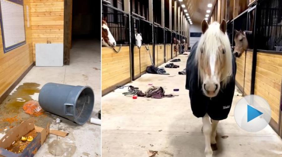 När Sarah kom till stallet på morgonen var allt upp och ner. Täcken låg slängda på golvet och morötterna var nästan uppätna. Muffinsen var tydligen inte så goda. Mitt i stallgången stod den skyldige, en söt haflingerherre som tagit sig ut ur boxen och roat sig under natten.
