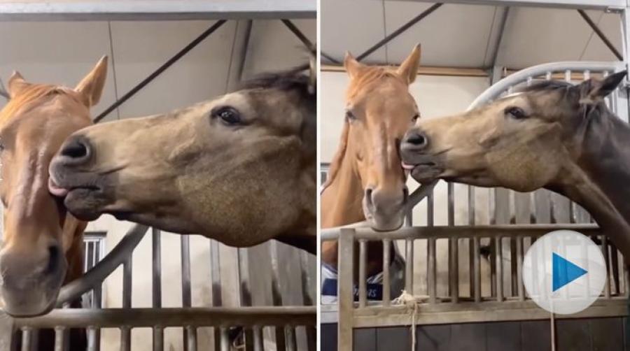 Det gäller att berätta för sina vänner hur mycket man gillar dem. Den här hästen visar det med en riktigt blöt "puss". Se det gulliga klippet ovan eller på Instagram.