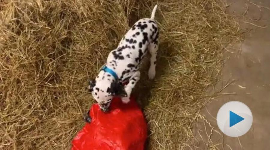 Enligt husse Fredrik Vedin så är den sötaste hjälpredan i stallet hans dalmatiner Lexi, i klippet 9 veckor gammal, som gärna hänger med till stallet för att packa några höpåsar.