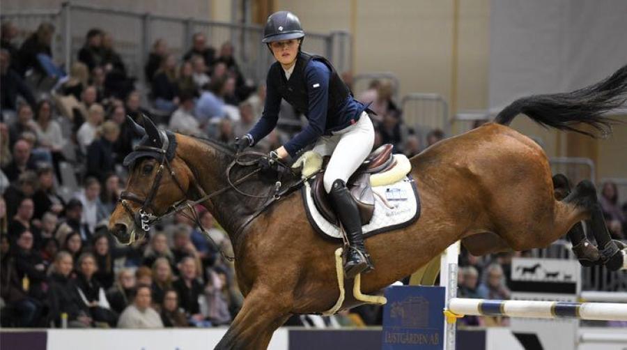 20 fyraåringar hade tagit sig till Jönköping Horse Shows fyraårsfinal. Väl där var det Stall Madick's Drei som fick allra högst betyg av domarna, lotsad runt banan av Evelin Lavén. Stolt och glad uppfödare är Annette Karlsson.
