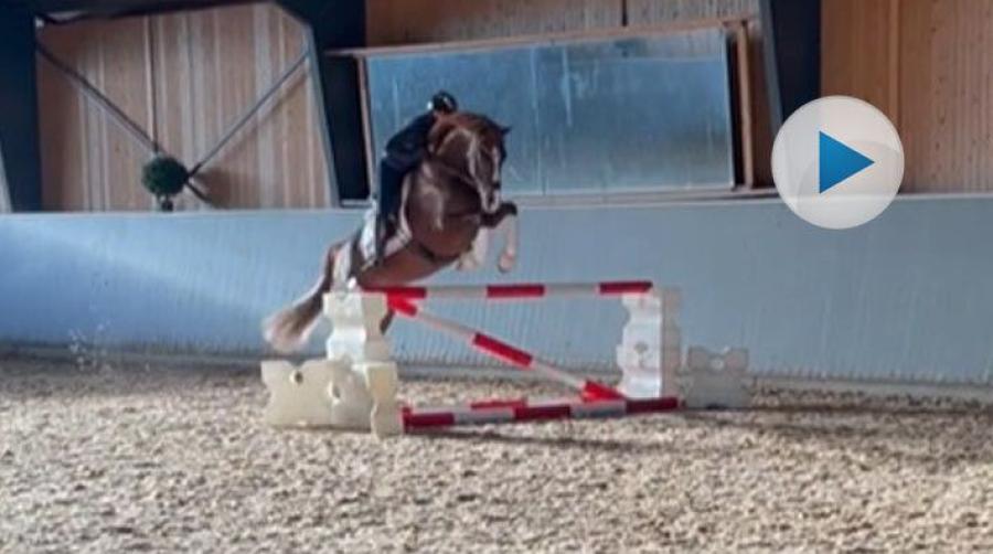 Johanna Due Boje och Keane brukar tävla i dressyr, men på hemmaplan tar de även några språng ibland. Spana in klippet där de tar sig an hindret med enkelhet – i dressyrsadel.