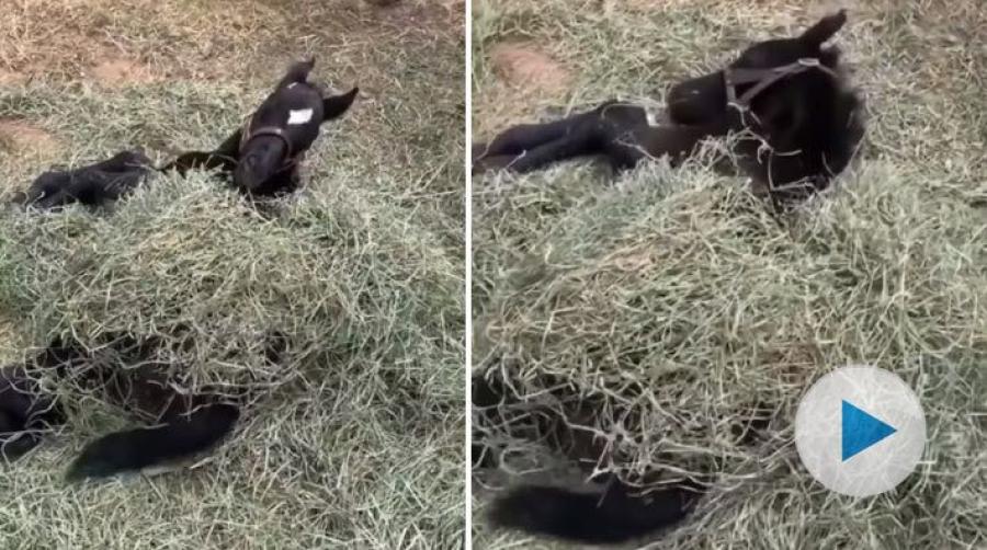 Vem vill inte ha en mysig filt när det är dags för en tupplur? Det här fölet har skapat en härlig säng mitt i höet.