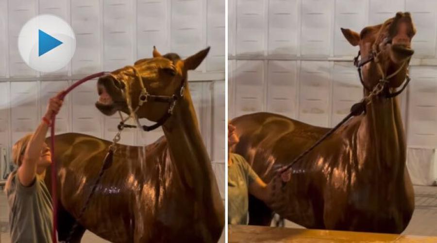 Gillar din häst att bli tvättad? När hästskötare Lina Andersson kommer för att svalka H&M Indiana passar stoet även på att dricka och leka lite samtidigt.