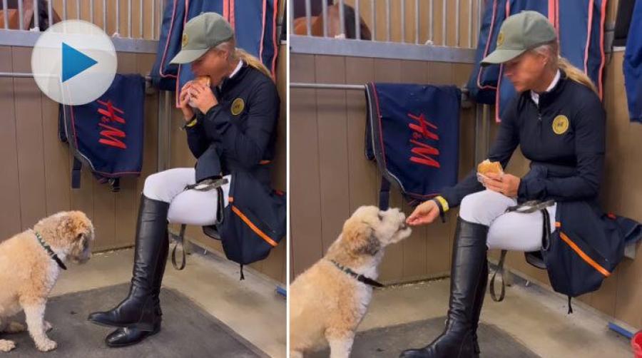 Är era stallhundar också med när det vankas fika i stallet? Malin Baryard Johnsson delar sin frukostfralla med sin hund, Wilmer, som glatt tar emot en smakbit.