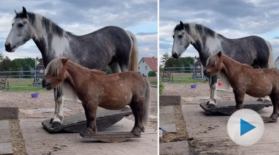 De här två kompisarna, Joost och Jonny, tränar ofta tillsammans. I detta klippet är det på varsin vippbräda som de gungar i takt. Klippet kommer från kontot tierzirkus_jeden_tag som tränar hästarna med hjälp av klickerträning.