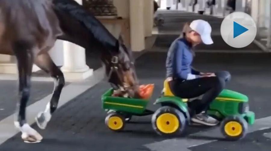 Den här hästen får snällt traska på stallgången för att få ta del av smaskiga äpplen och morötter.