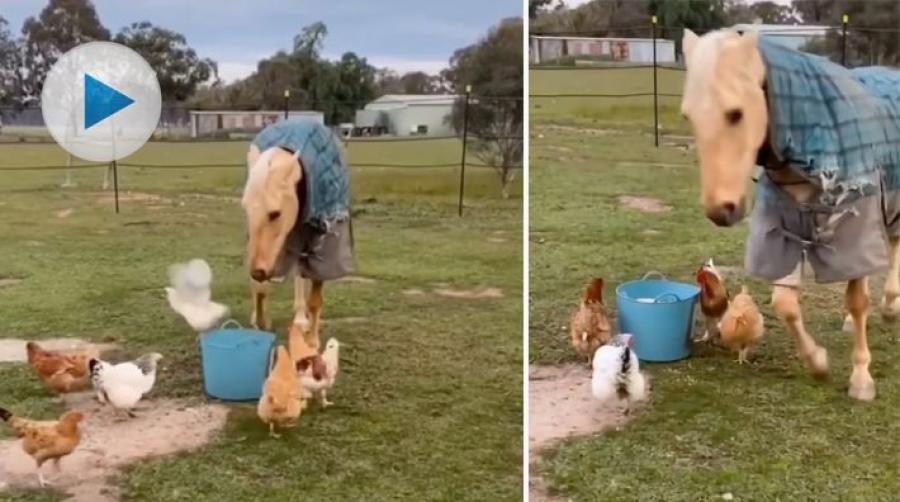 Den här hästen har fått oväntade och snyltande gäster och är inte helt nöjd med det. Hönsen springer omkring överallt och sitter dessutom mitt i maten! Vilken pärs ... Se klippet ovan eller via länken till Instagram.
