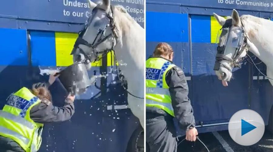 Den här polishästen tycker inte alls att det är nödvändigt att dricka vattnet. Det är mycket roligare att skvätta det över den tvåbenta kamraten. Missa inte slutet av klippet – med den minen måste det vara en häst med humor, eller vad tror ni.
