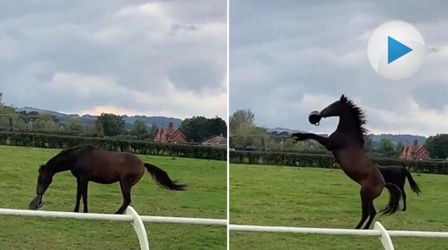 Ibland kan de enklaste leksakerna vara de roligaste. Det tycker i alla fall den här hästen, som har hittat en krubba att kasta upp och ner. Visst verkar han ha roligt?