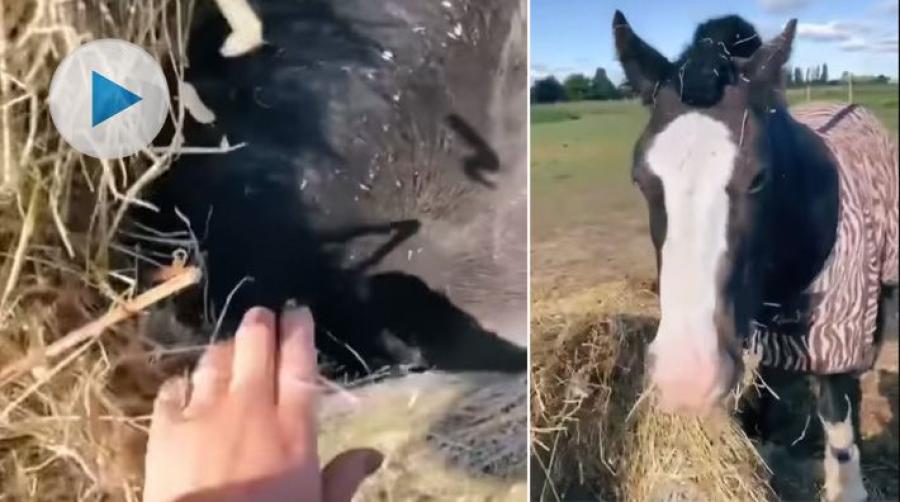 Vissa säger att gräset är grönare på andra sidan. Den här hästen tycker att höet är godare i botten av balen. Det är bara inte lika enkelt att komma åt, men det verkar helt klart vara värt det att dyka ner i högen.