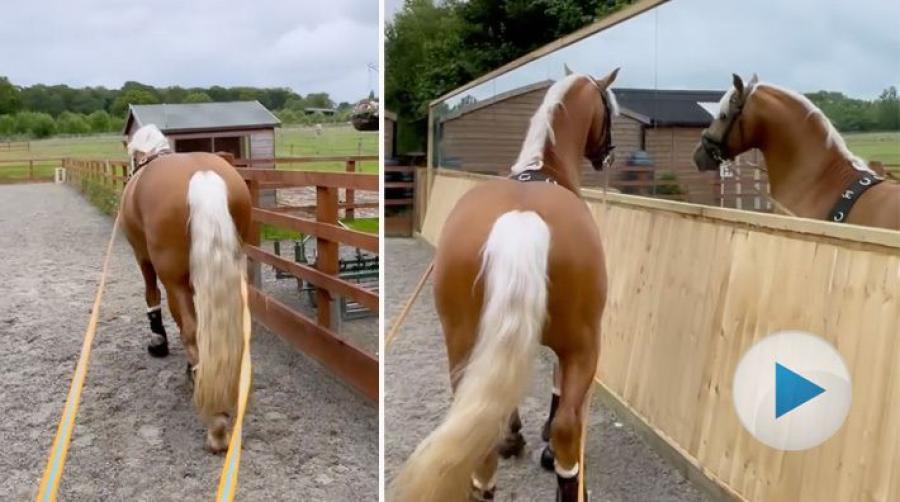 Mitt under träningspasset får den vackra hingsten Comet syn på en spännande individ, alldeles intill banan. Då är det bäst att hälsa ordentligt.