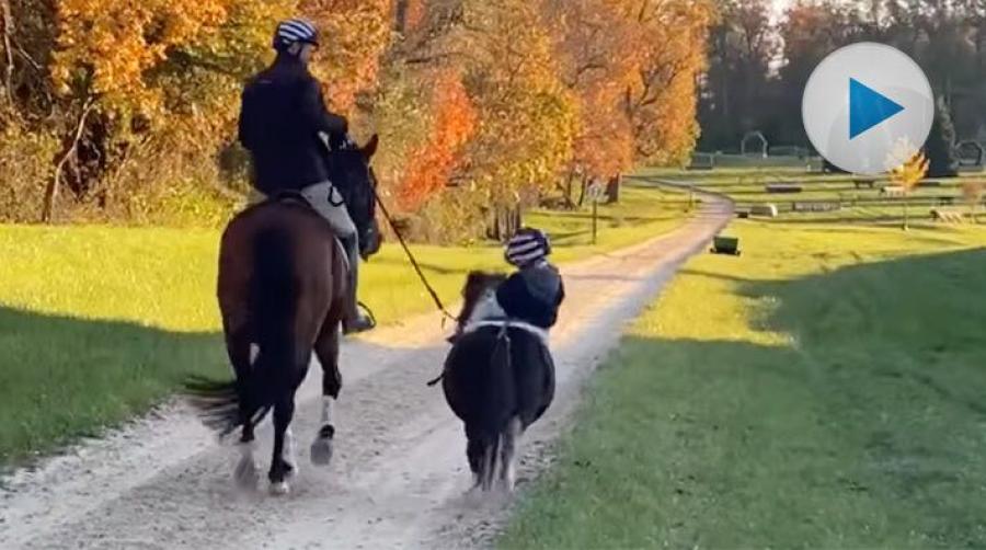 Det är inte lätt att hitta den rätta balansen på hästen när man är nybörjare. Här är det en liten elev vid en ridskola i USA som tappert sitter kvar på ponnyn men till slut så går det inte längre.