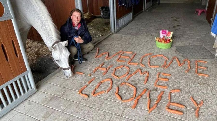 Martin Fuchs tävlingskamrat Clooney skadade sig illa i hagen tidigare i somras och har vårdats på klinik sedan dess. I början var det osäkert om han skulle klara sig alls. Nu meddelar Martin Fuchs på sociala medier den glada nyheten att Clooney fått lov att komma hem. En rejäl välkomstkommitté och massor av morötter väntade skimmeln hemma i stallet.