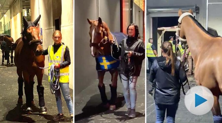 Söndag kväll landar de fyra svenska hopphästarna i Tokyo. Veterinär Axel Wallman var med när de lastades på planet i Liege, Belgien, på lördagen. I klippet ovan ska Indiana kliva in i flygboxen.