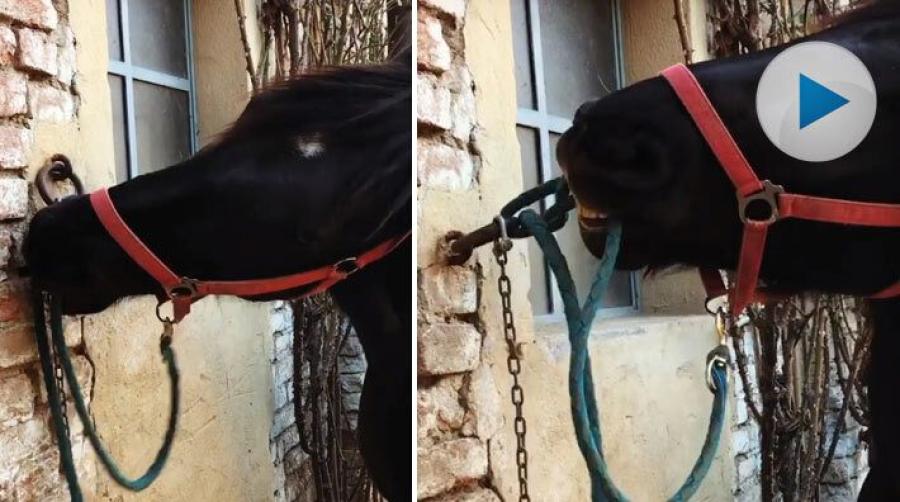 Vissa hästar är lite listigare än andra. Den här hästen har nämligen lärt sig att enkelt ta sig loss från uppbindningsplatsen genom att helt enkelt knyta loss grimskaftet. Har ni någon extra listig häst i ert stall?