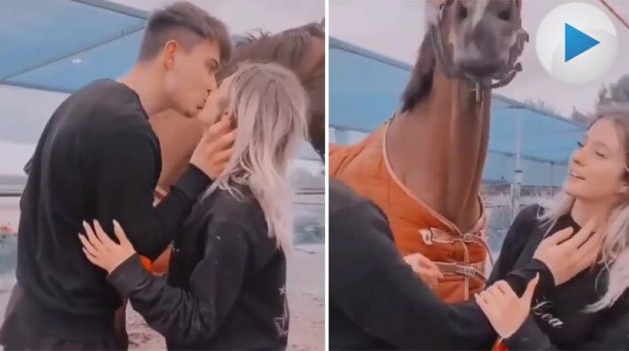 Den här hästen gillar inte att dela uppmärksamheten. Den tar helt enkelt och bryskt avslutar pusskalaset.