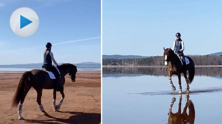Ebba Kriga Tengvall och hennes SWB-valack Apricot Brandy fick en riktig drömritt häromdagen, när vårvädret visade upp sig från sin bästa sida. Under några veckor varje vår är det lågvatten i Orsasjön och då finns det en fantastisk strand att rida på.