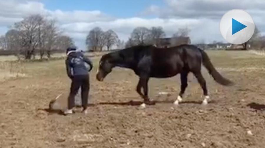 När Nathalie Safko skulle mocka hagen bestämde sig hennes häst Julian för att hon behövde hjälp. Nathalie skickade in filmen som vi får lov att dela. Hon skickar även med en hälsning. Det var Nathalie och Julian som var med i en artikel på Hippson för två år sedan. Då hade de skrämts av en buss som passerade dem i hög fart.
