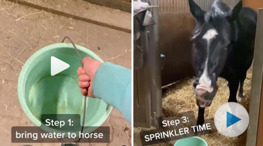 Först hämtar man en hink med vatten. Sedan får hästen dricka. Efter det får alla i närheten en välbehövlig dusch. Så kan det gå hos den här söta pållen.