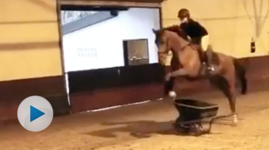 Axelina Pettersson Häggström bjuder på ett klipp när hon och hästen Viva la Diva Samott hoppar en serie skottkärror i ridhuset. Pappa Björn Häggström tar sig sedan an samma utmaning.