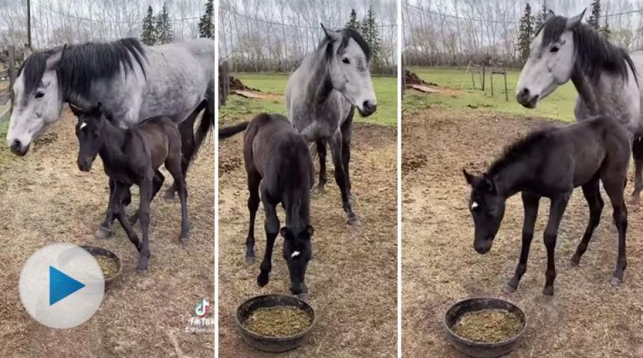 Trots att man är liten och ung kan man ha en stor karaktär och en stark vilja. Det visar inte minst den här lilla fölungen, som minsann inte tänker släppa fram någon annan till maten.