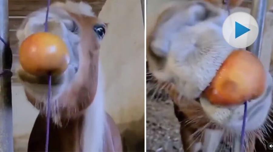 Den här hästen får kämpa för att få tag i godiset – i det här fallet ett äpple. Att något så gott kan vara så retsamt svåråtkomligt.