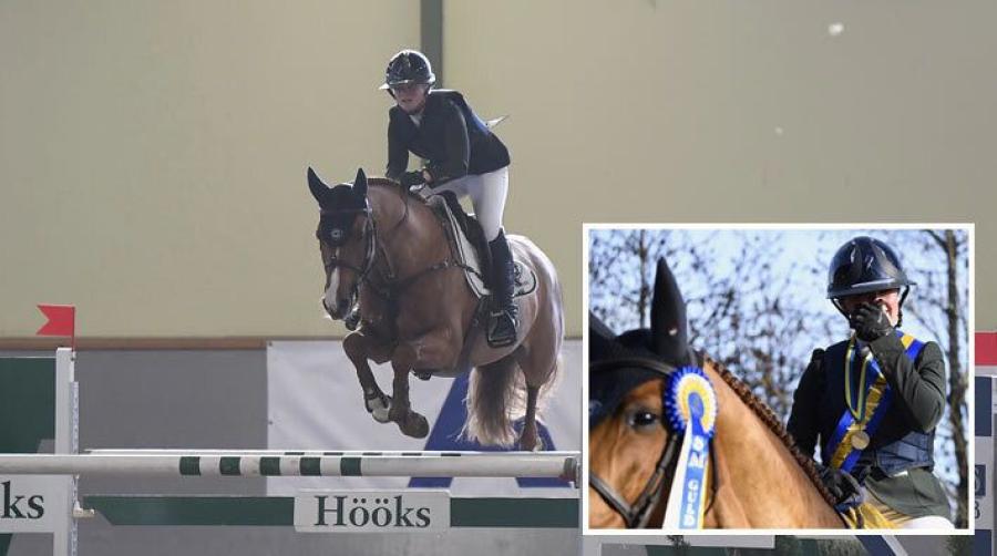 Julie Carlberg var rörd till tårar när det stod klart att hon vunnit SM-guld efter omhoppning mot silvermedaljören Philip Svitzer. Den tioåriga hingsten CCStud’s Fidelity är familjens egen uppfödning.