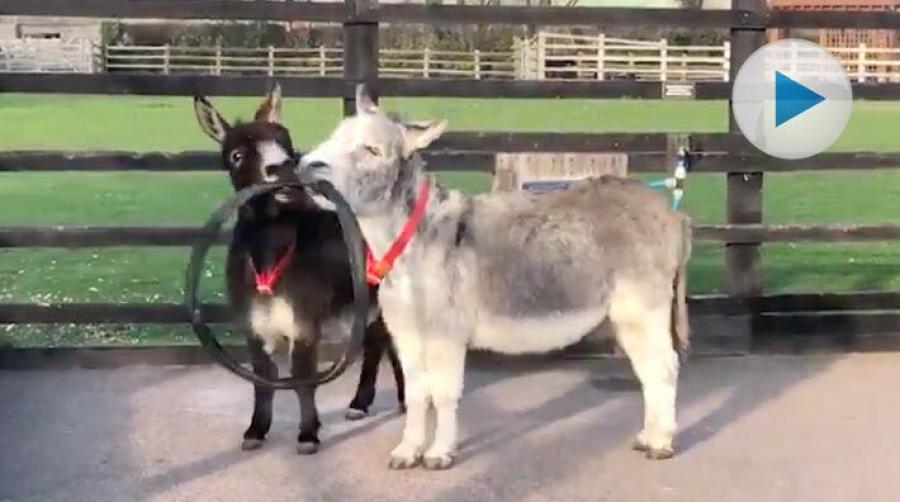 Det är alltid roligare att leka två än ensam. Som de här två söta åsnorna som delar på bästa leksaken – ett cykeldäck.