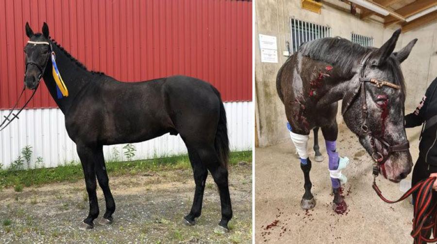 En sen kväll i ett ridhus i Umeå hände det som inte får hända. Valacken Challe kom lös och hoppade rakt in i en ridhusspegel. Olyckan innebar rejäla skador med över trettio stygn och nio dagar på klinik. I dag vill Challes ägare påminna om farorna med speglar.
