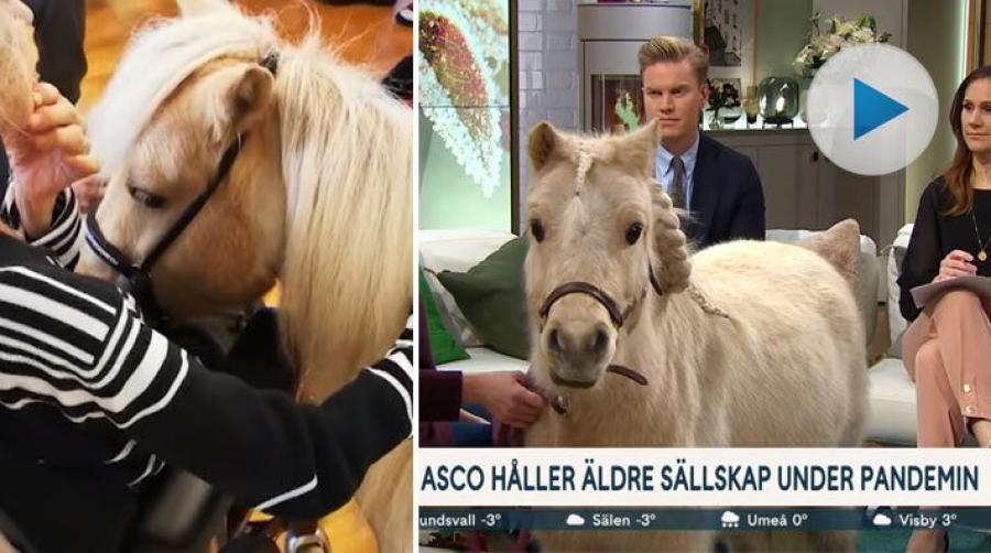 Miniatyrhästen Asco besökte TV4 Nyhetsmorgon, tillsammans med Therese Saarinen som berättade om deras arbete och besök hos äldreboenden. Besöken har varit väldigt uppskattade bland de äldre och Therese berättar att en del personer har gråtit av glädje vid deras besök. Se hela intervjun i klippet.