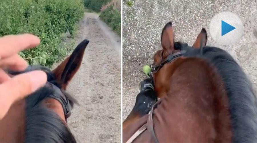 Peder Fredricson kör apportträning med H&M Christian K på ridturen. Peder kastar päron och Christian K hämtar. Belöningen? Att få äta päronet såklart!