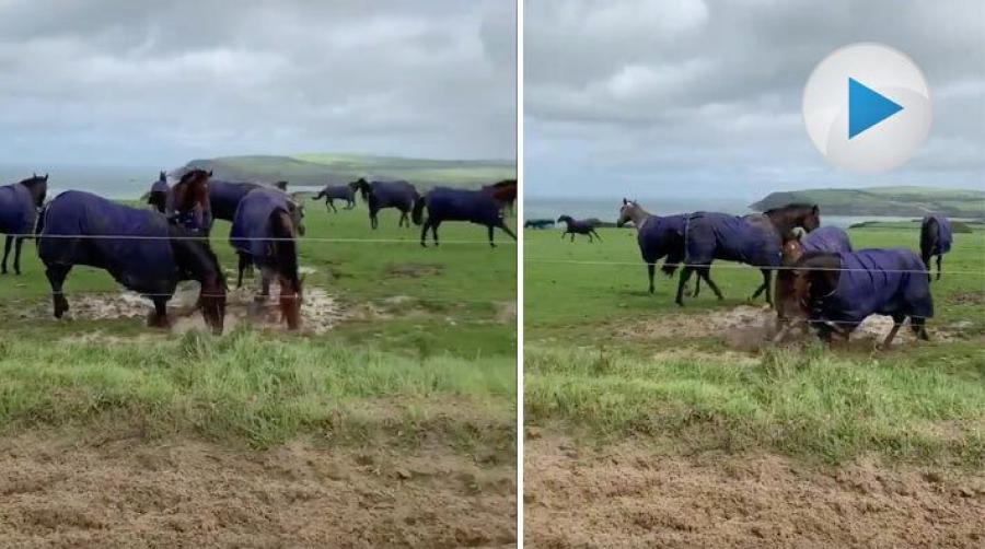 De här hästarna har en hage som är enorm. Ändå väljer de att köa till hagens enda lerpöl. Att skvätta och gräva i geggamojan syns vara det bästa av allt.