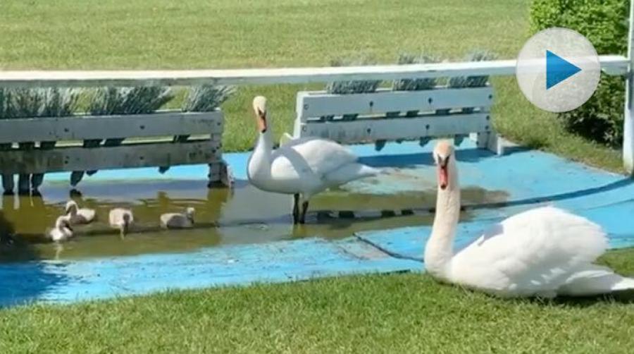 Tyvärr, det blir ingen träning på vattenhindret i dag. Det har blivit ockuperat av en svanfamilj. Det blir till att träna på annat helt enkelt. Det är den brittiska hoppryttaren Joe Stockdale som delar med sig av sitt söta vardagsbekymmer.