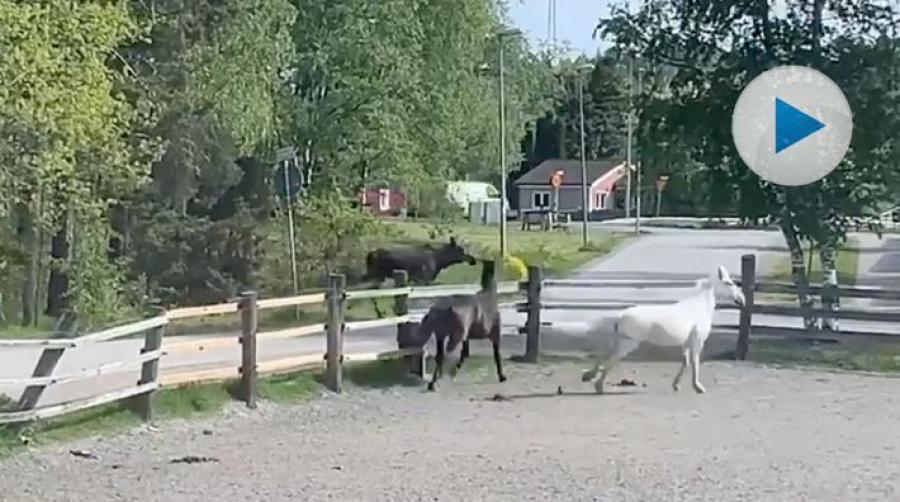 Ridskolehästarna fick oväntat älgbesök: "Första gången vi ser älgar här"
