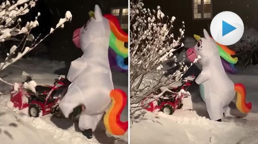 Snön lyser med sin frånvaro i många delar av landet. Vissa njuter till fullo, medan andra längtar tills marken är täckt av ett vitt och fluffigt snötäcke. Oavsett vilken av dessa personer du är kan nog det här härliga klippet på en dansande "unicorn", körandes snöslunga, lätta upp i vintermörkret.
