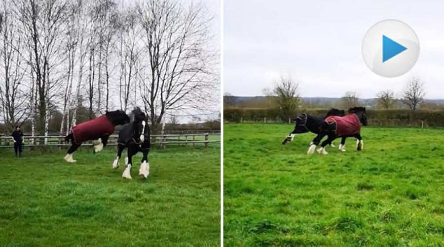 Glada shirehästar svämmar över av vårkänslor på betet