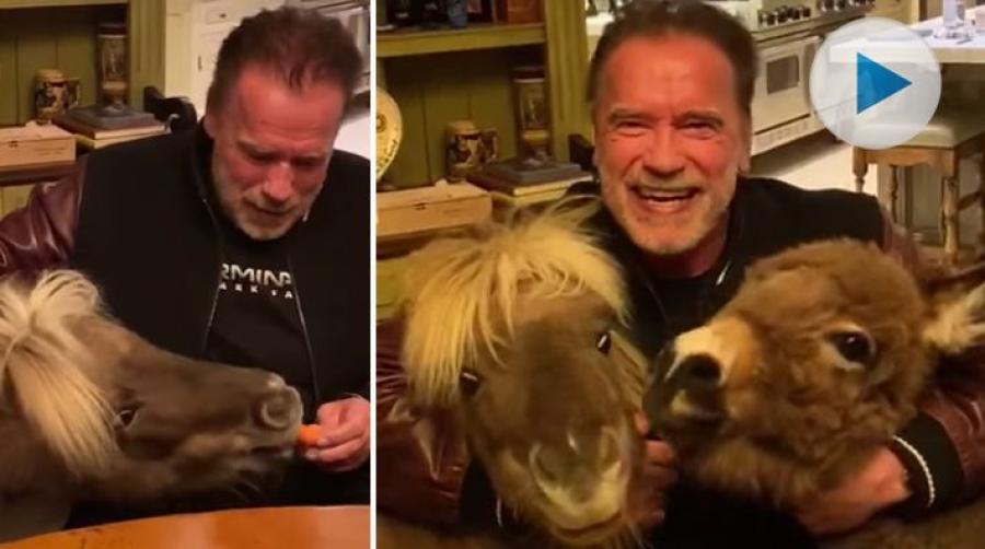 Terminator-stjärnan Arnold Schwarzenegger uppmanar sina fans att stanna hemma för att undvika smittspridning. Den tidigare guvernören är 72 år och bor i Los Angeles – där bland annat barer, restauranger och gym håller stängt. Två fyrbenta små kompisar håller honom sällskap.