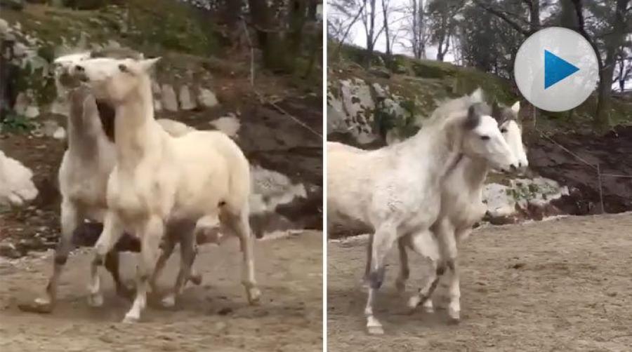 De här två hästarna roar sig med en pinne och likt två hundar har de dragkamp om den. Men så är det ju så mycket roligare att leka tillsammans än ensam.