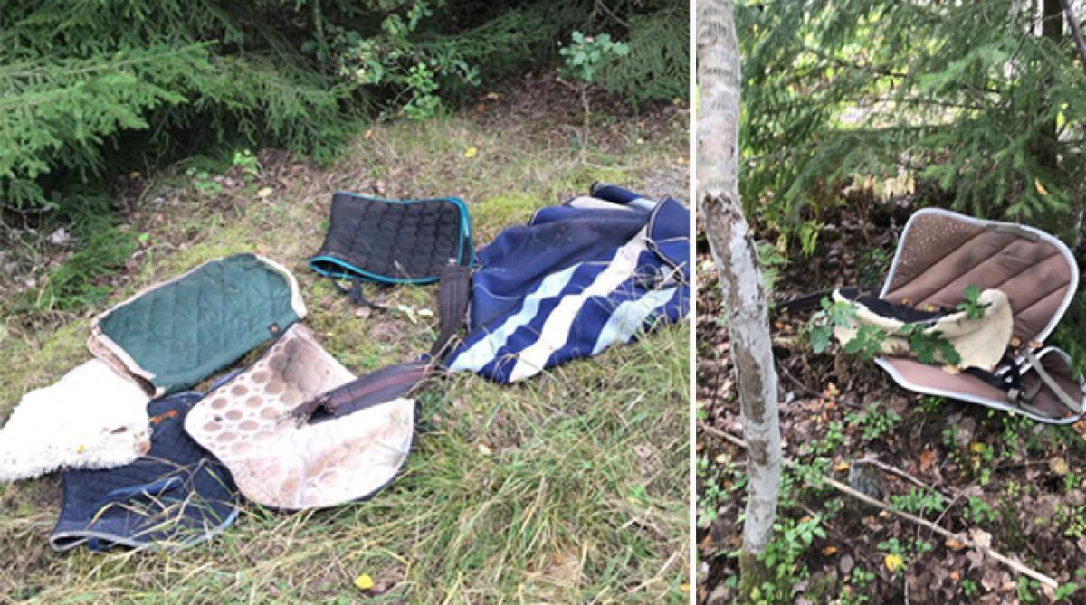 På väg hem från stallet hittade Hannah Eriksson schabrak och sadelgjordar slängda i skogen. Hon sökte efter ägaren på Facebook, och fick kontakt. Det visade sig att sakerna stulits från ett stall nästan två mil bort.