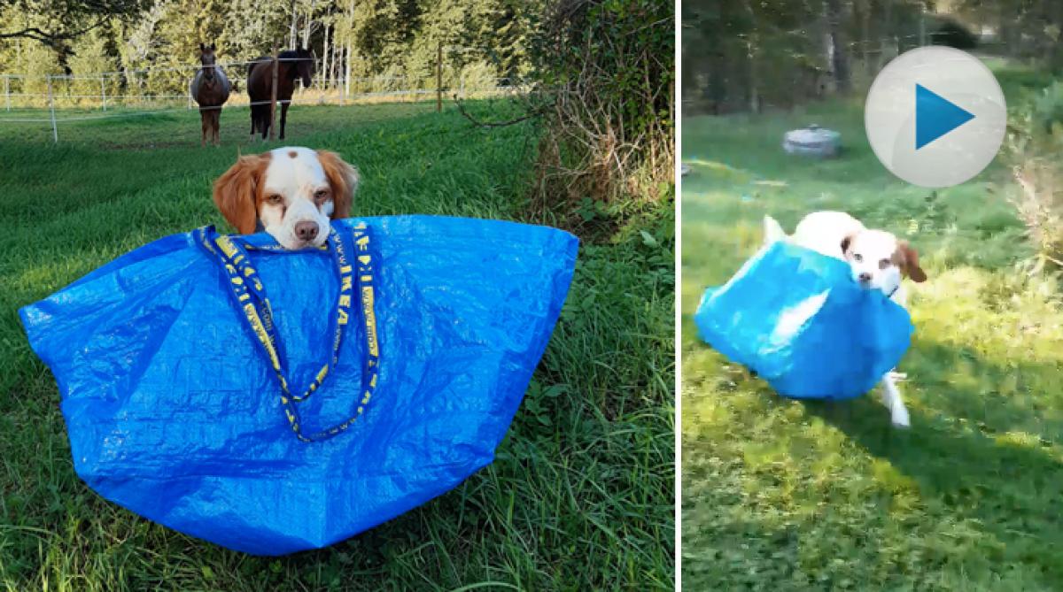 När My Jakobsson upptäckte att höpåsarna hon hängt upp utomhus fladdrat i väg i vinden fick hon hjälp från ett lite oväntat håll. Den treåriga hunden Gimli var med på noterna direkt när hon bad honom att apportera påsen.