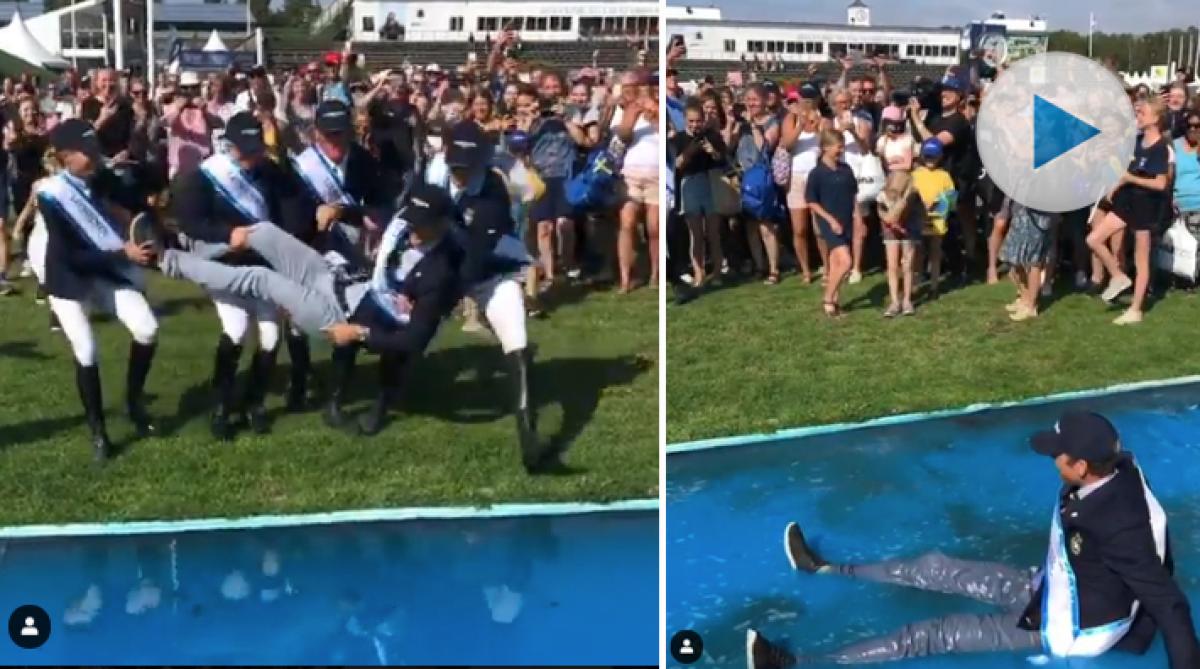 De svenska hoppryttarna säkrade en seger på hemmaplan i Nations Cup och stämningen var på topp i Falsterbo, där publikens jubel inte ville tystna. Efter prisutdelningen fick de som ville gå ner på gräsbanan för att se de maffiga hindren på nära håll. Då passade även hopplaget på att "hylla" sin förbundskapten, Henrik Ankarcrona, som fick ett fint plask i vattengraven.