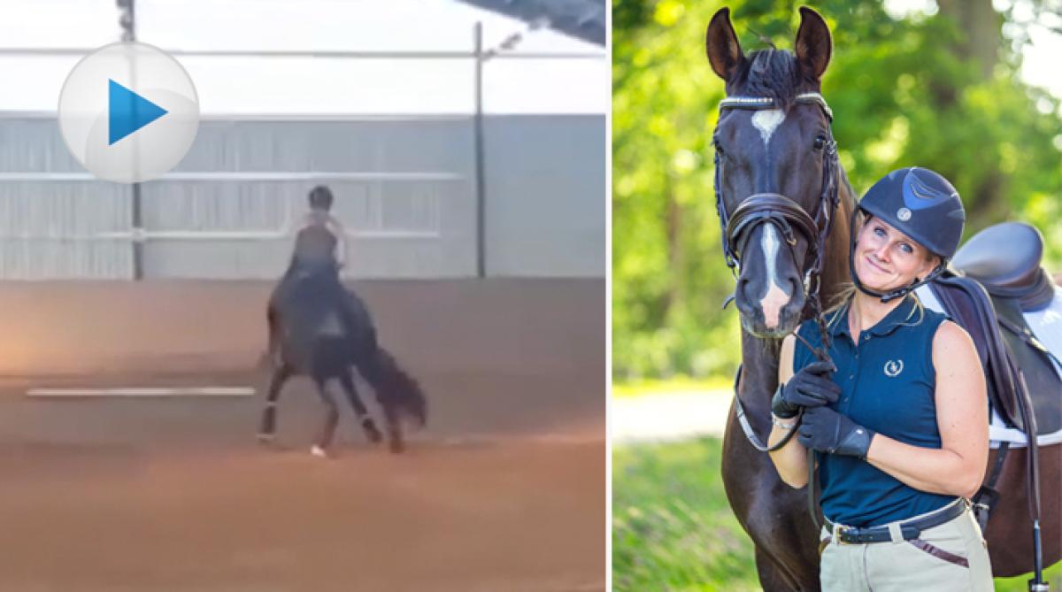 När Therese Selander red sin valack ER Lancerot för några dagar sedan fick hon öva på balansen när hästen plötsligt tog ett stort skutt åt sidan. Orsaken? Dressyrhästen skrämdes av spår av bommar på marken. Se det roliga klippet ovan (med ljudet på!) och läs mer om vad som hände.