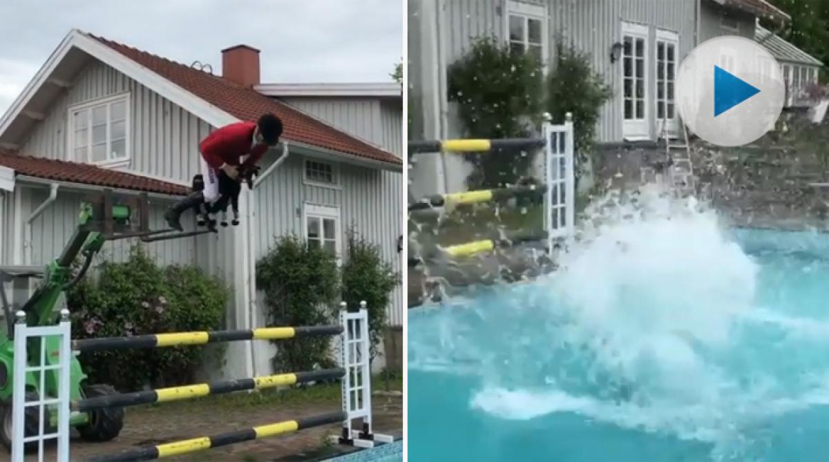 Svettiga sommardagar kan det vara skönt med ett dopp i poolen. Men fälttävlansryttaren och influeraren Pontus Hugosson nöjer sig inte med det. Han flyttar hinderbanan till bassängen och fortsätter hoppträningen där.