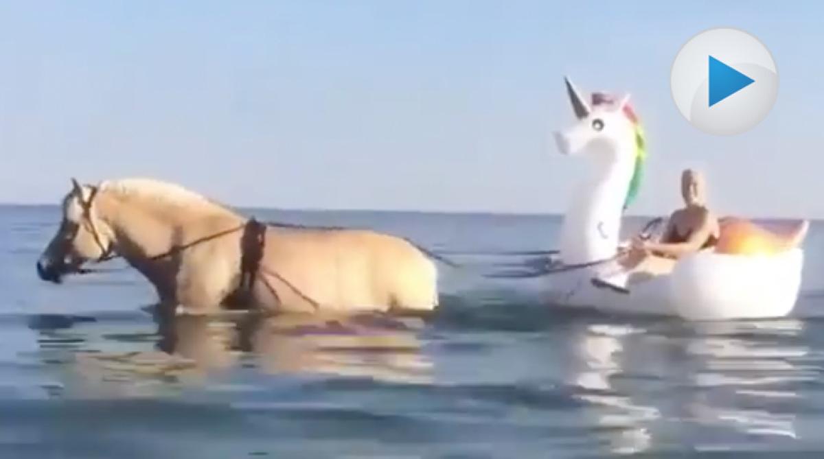 Sommaren står för dörren – och vad passar då bättre än lite badinspo till häst? Fram med körgjorden, tömmarna och sist, men inte minst, en uppblåsbar unicorn. Sedan är det bara att sig till närmaste strand för njuta av en stillsam körtur i vattnet.